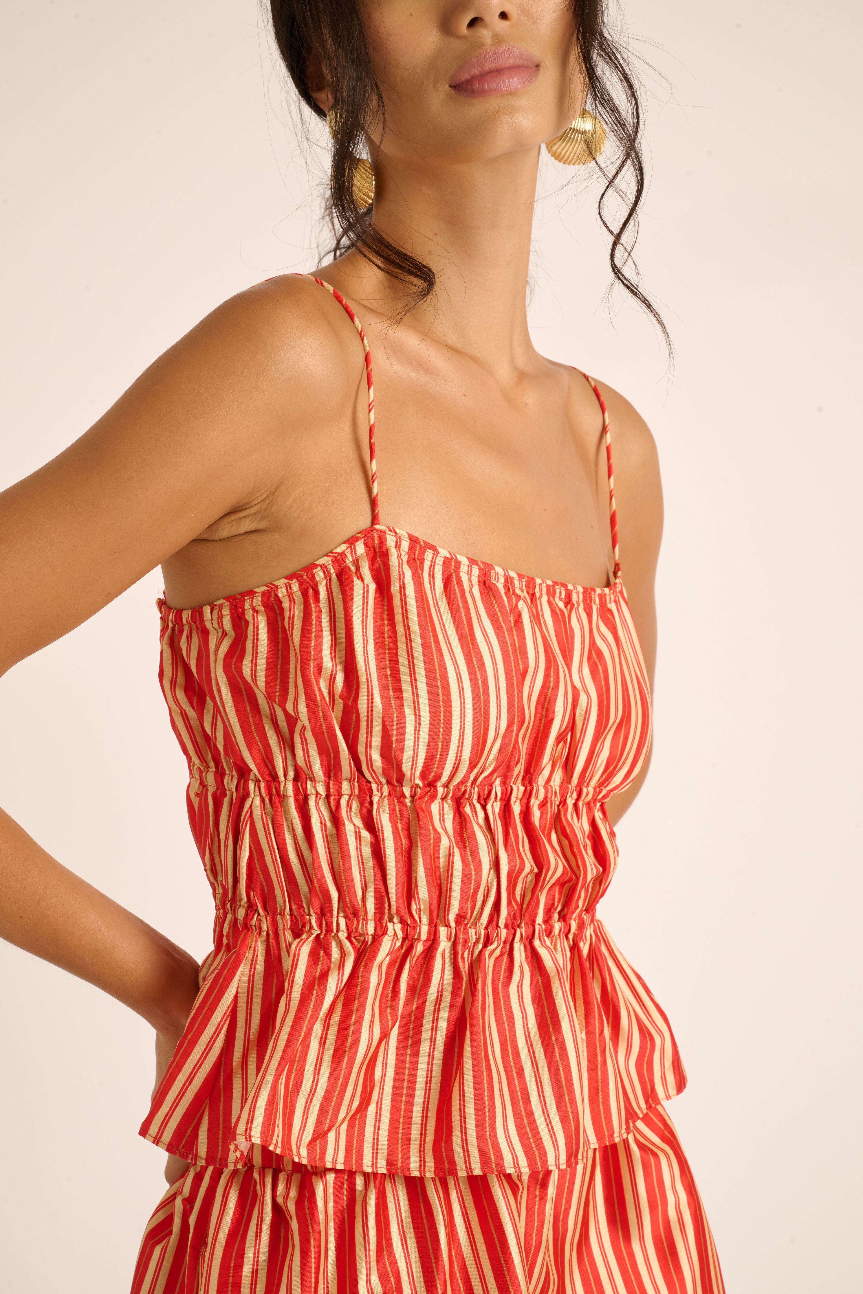 Introducing Beatrice in Candy Stripe — A festive nod without the fuss. Our newest cami brings a soft, seasonal feel with its red stripe palette and easy peplum shape. Light, feminine, and dressy enough for holiday moments home or away—pair it with the Celeste or Nicole for a set that feels effortlessly celebratory.