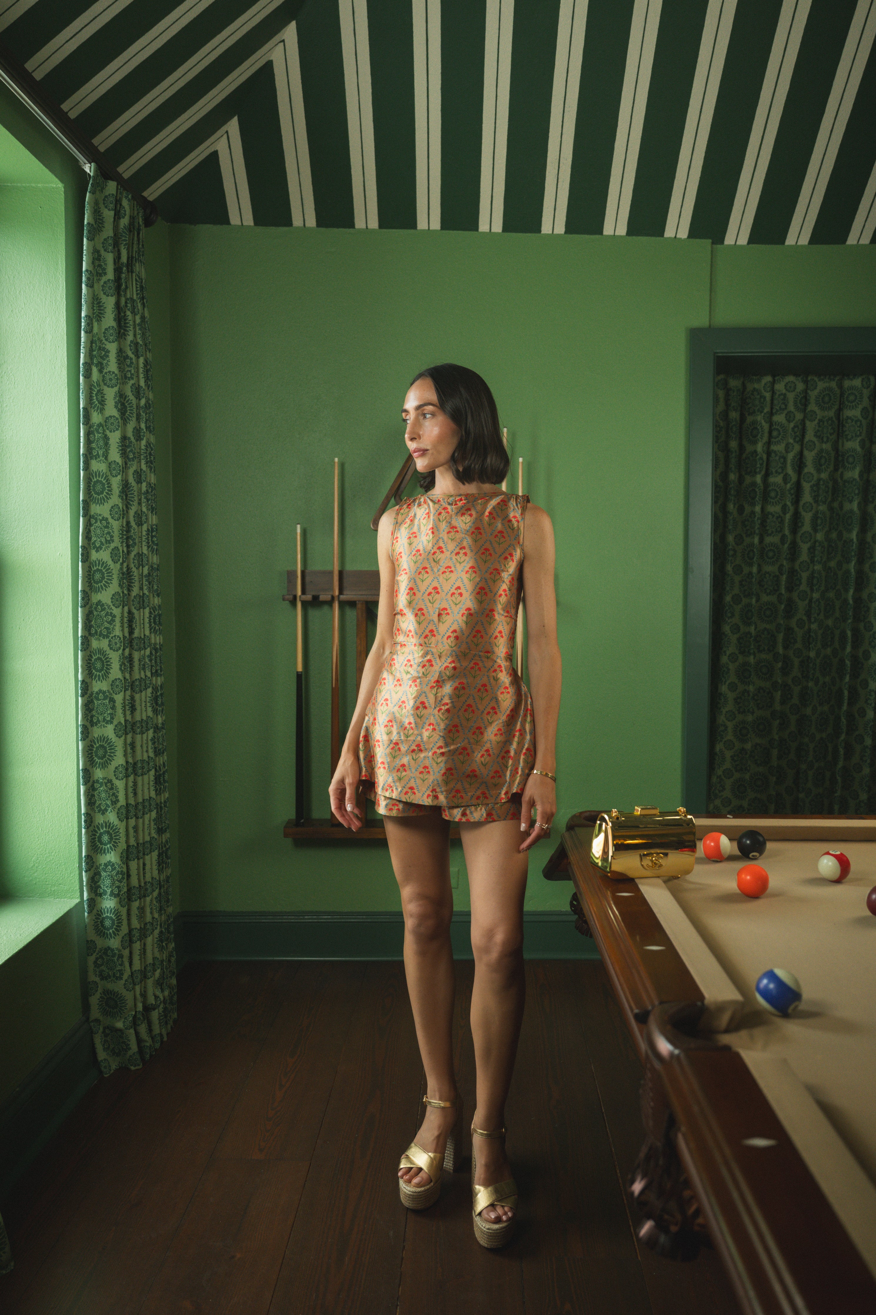 I'm obsessed with our Celine Top in this taffeta fabric! She's perfect for date night and holiday parties. Pair her with the matching Nicole Pant or the matching Bridges Short for when you want to show a bit more skin!