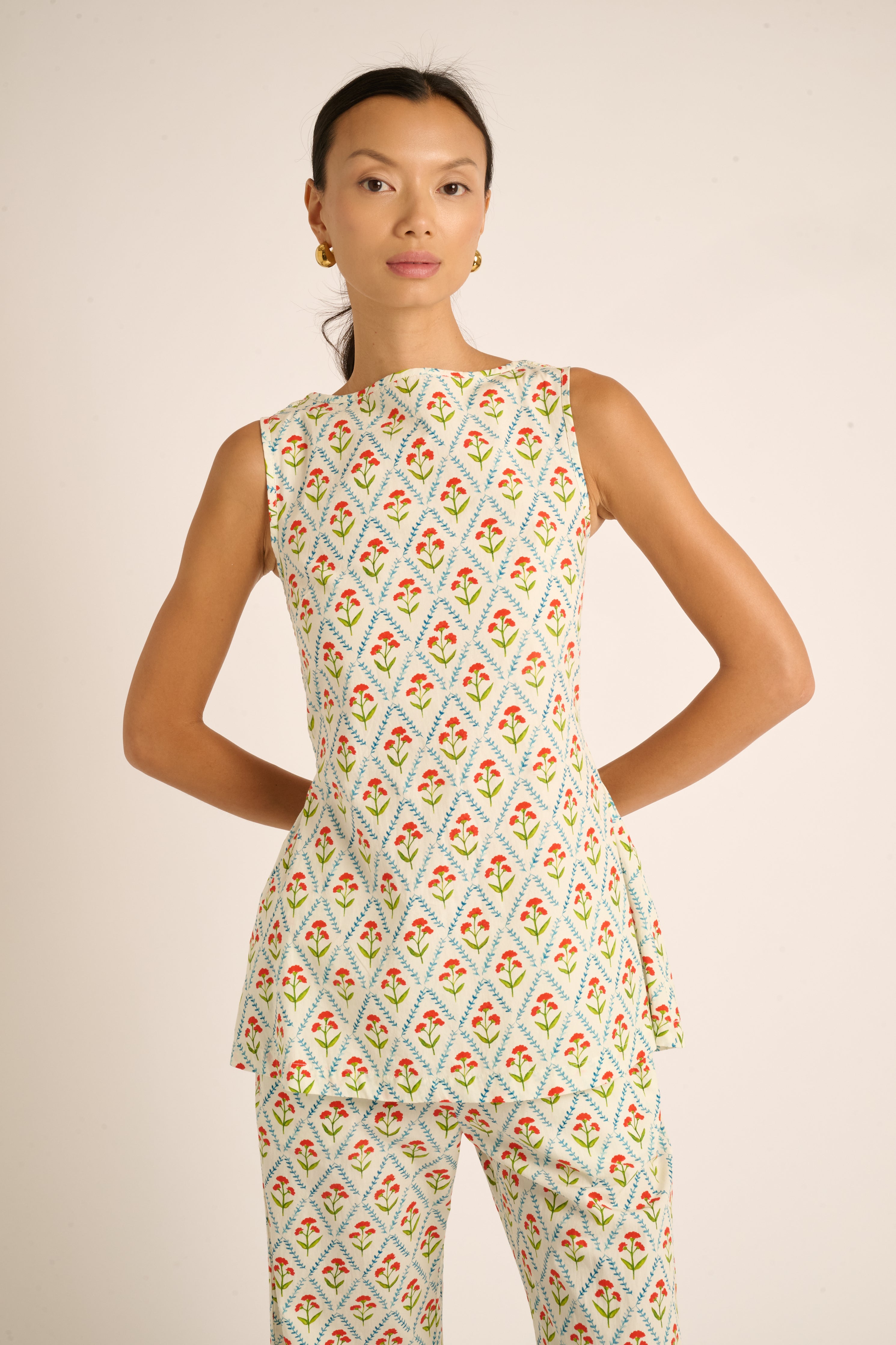 Our best-selling Celine Top was reimagined this collection in our exclusive ivory sky lattice floral print. She's bold, sophisticated and effortless. Featuring a boat neckline, sleeveless cut, smocked back and figure-flattering waistline, she offers a sculptural silhouette that's both elegant and fun.