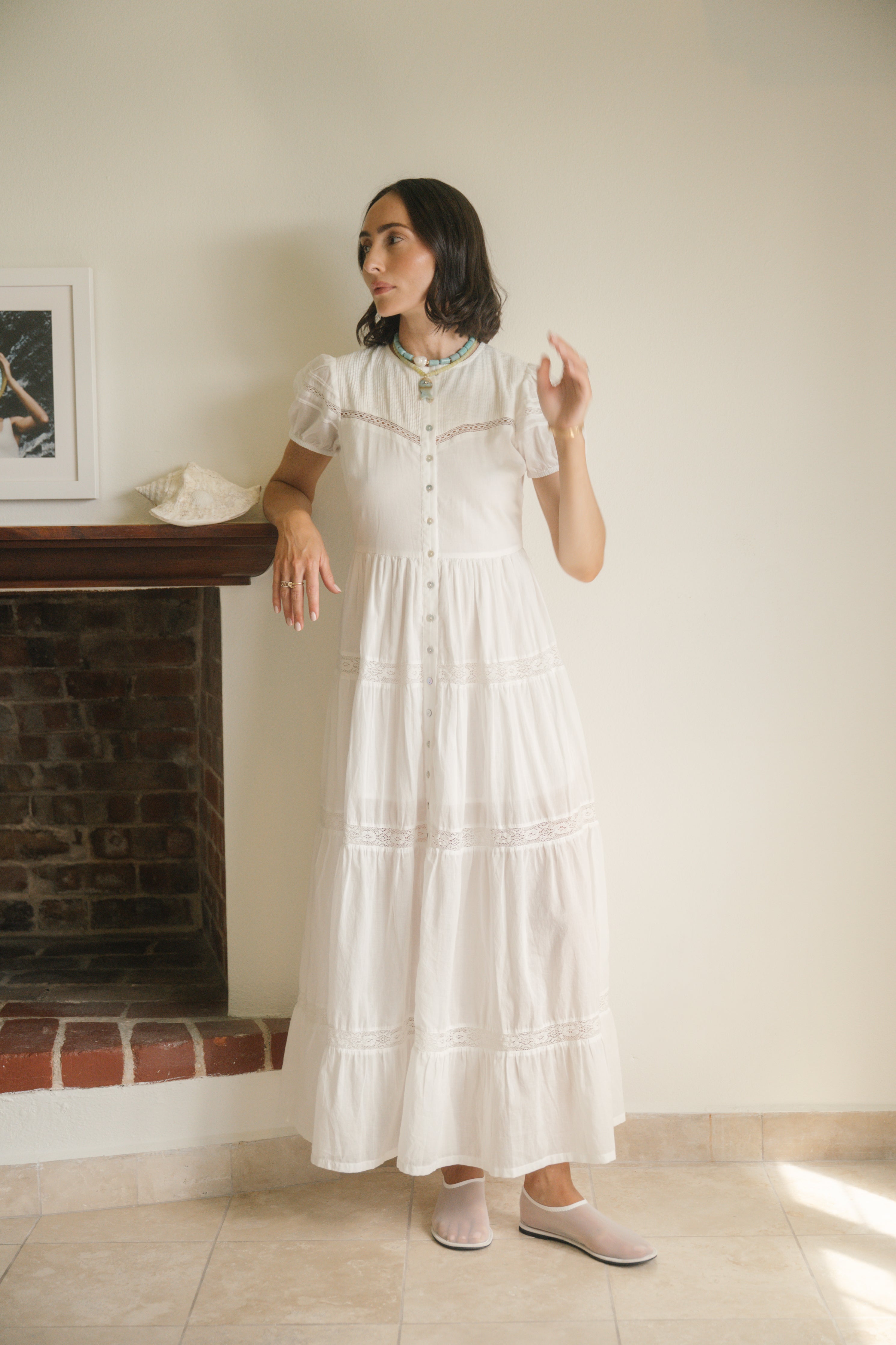 Introducing the Ella Dress! Ella was inspired by our favorite vintage pieces and is a forever dress. Crafted from lightweight cotton voile, the tiered dress moves beautifully with every step. Partially lined and designed with beautiful lace trims throughout the body, she's a go to for all warm weather activities.