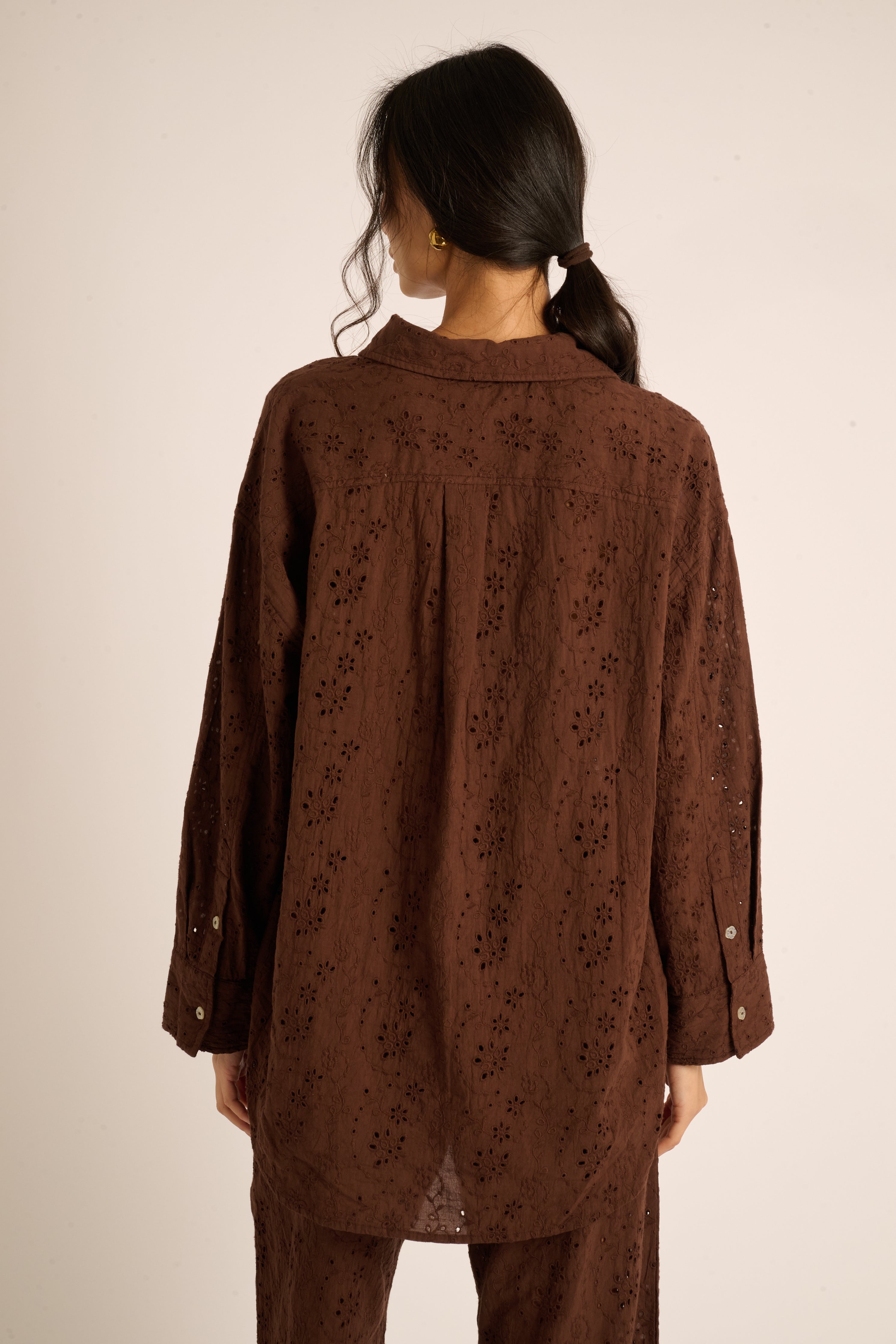 The Jane Top is a versatile wardrobe essential that effortlessly transitions from plane to pool. Designed in a soft cotton eyelet in a warm Mocha Brown, this Henley-style top is ideal for casual sun-filled days and getaways. Intentionally oversized, the Jane has a flowy but chic shape with a longer back for added coverage. We love that the delicate flower-shaped buttons add a thoughtful touch of feminine style.