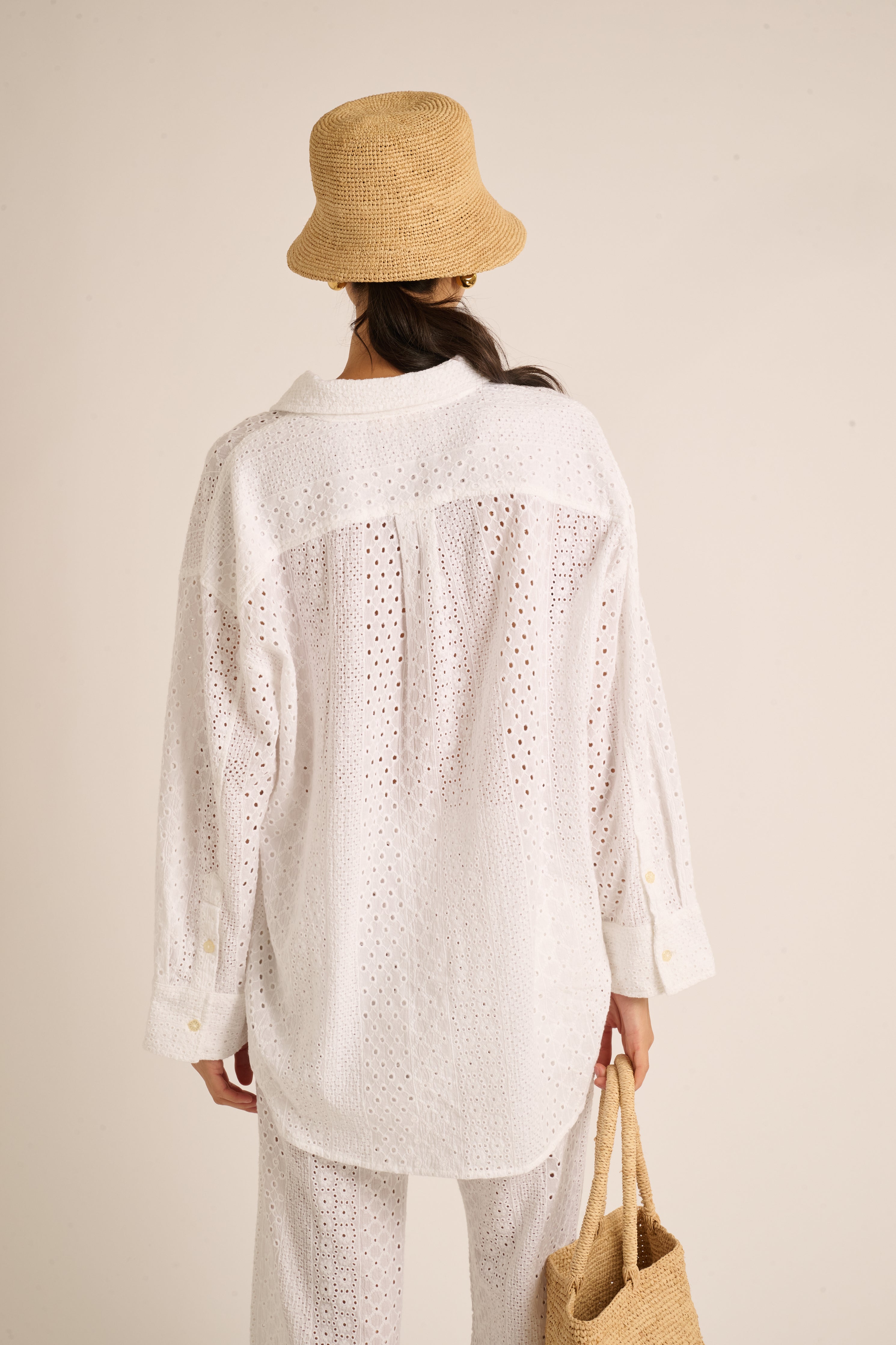 The Jane Top is a versatile wardrobe essential that effortlessly transitions from plane to pool. Crafted in a new dreamy eyelet, we adore the wide stripes of novelty embroidered shapes running throughout the top. The Jane is a Henley-style top ideal for casual sun-filled days and getaways. Intentionally oversized, she has a flowy, effortless shape with a longer back for added coverage. We love that the delicate flower-shaped buttons add a thoughtful touch of style.