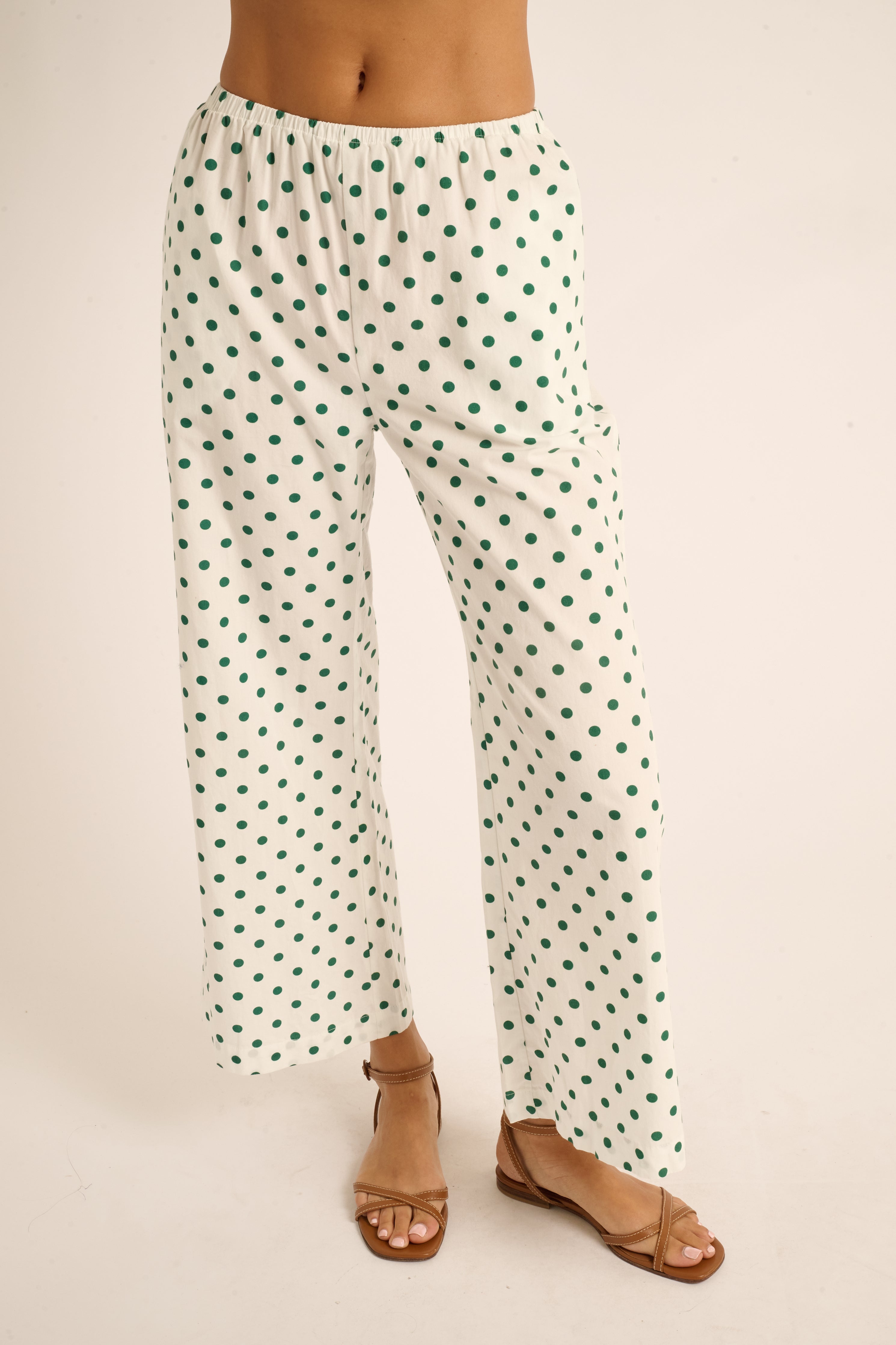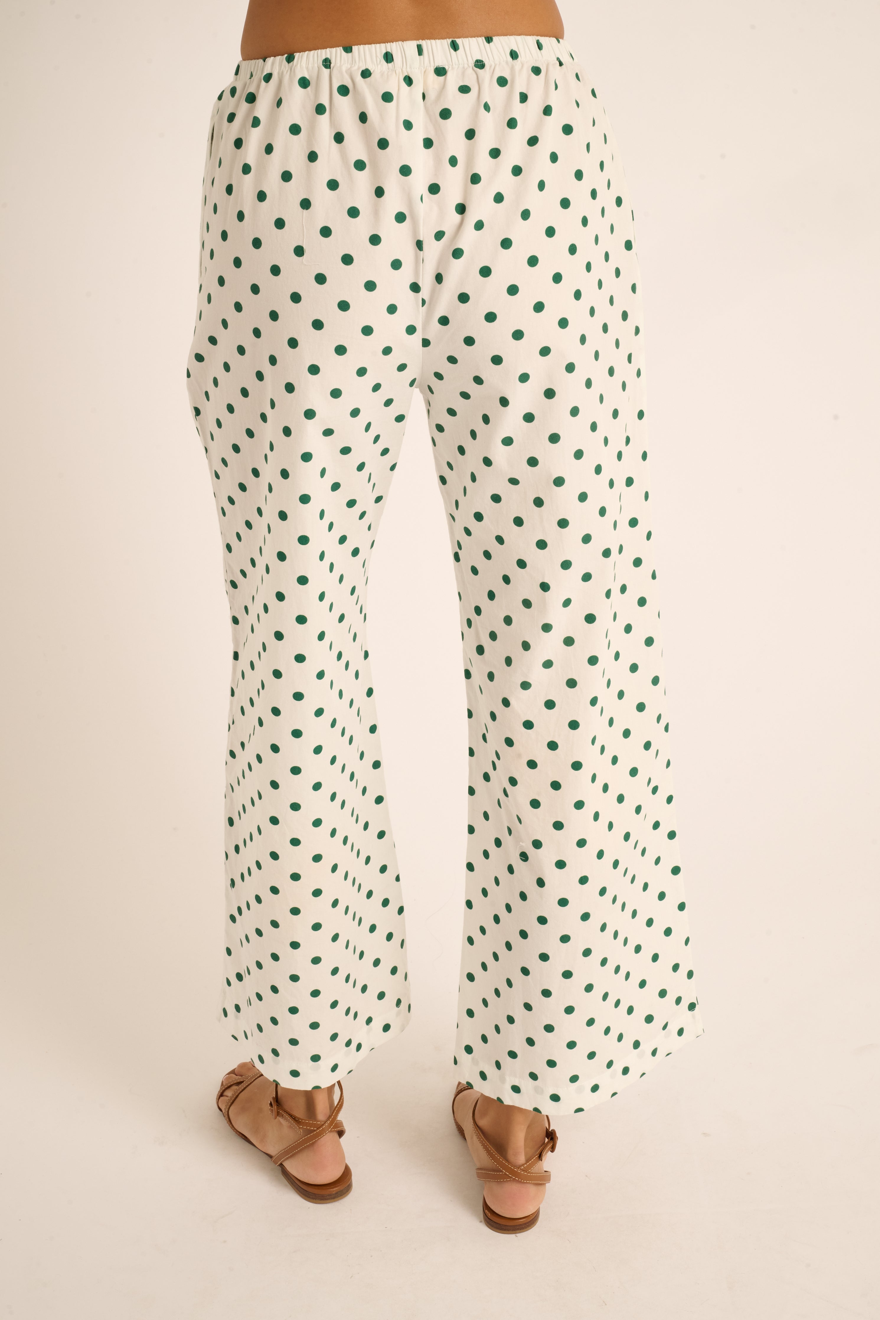 The Nicole pant is a wardrobe staple. Made in a soft cotton poplin with a thin, elasticized waist and subtle kick flare, she offers a relaxed yet polished fit. We love that the Emerald Polka Dot print offers a subtle yet impactful amount of boldness. Ideal for travel or leisurely beach days, the Nicole pant is an elevated, effortless bottom that offers endless styling possibilities.