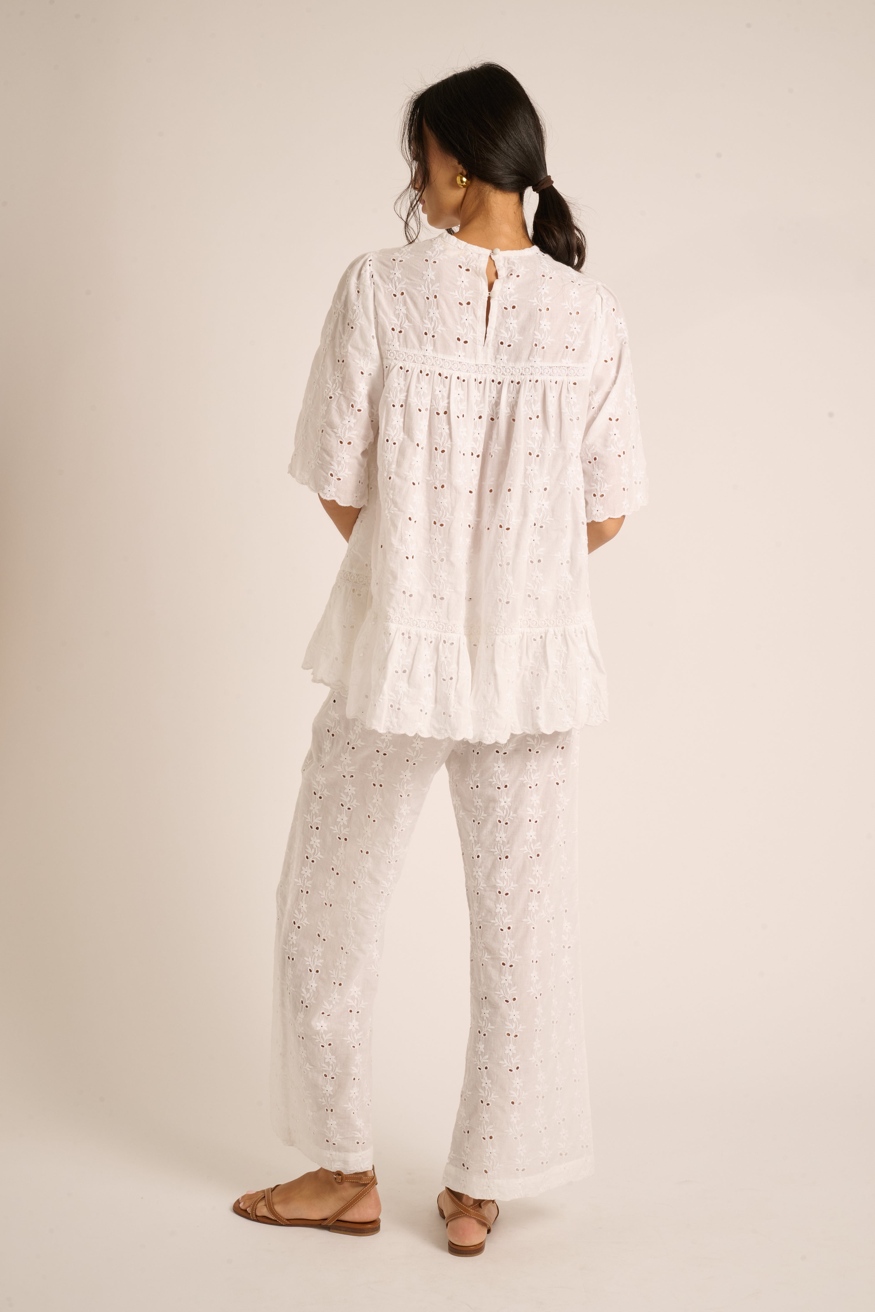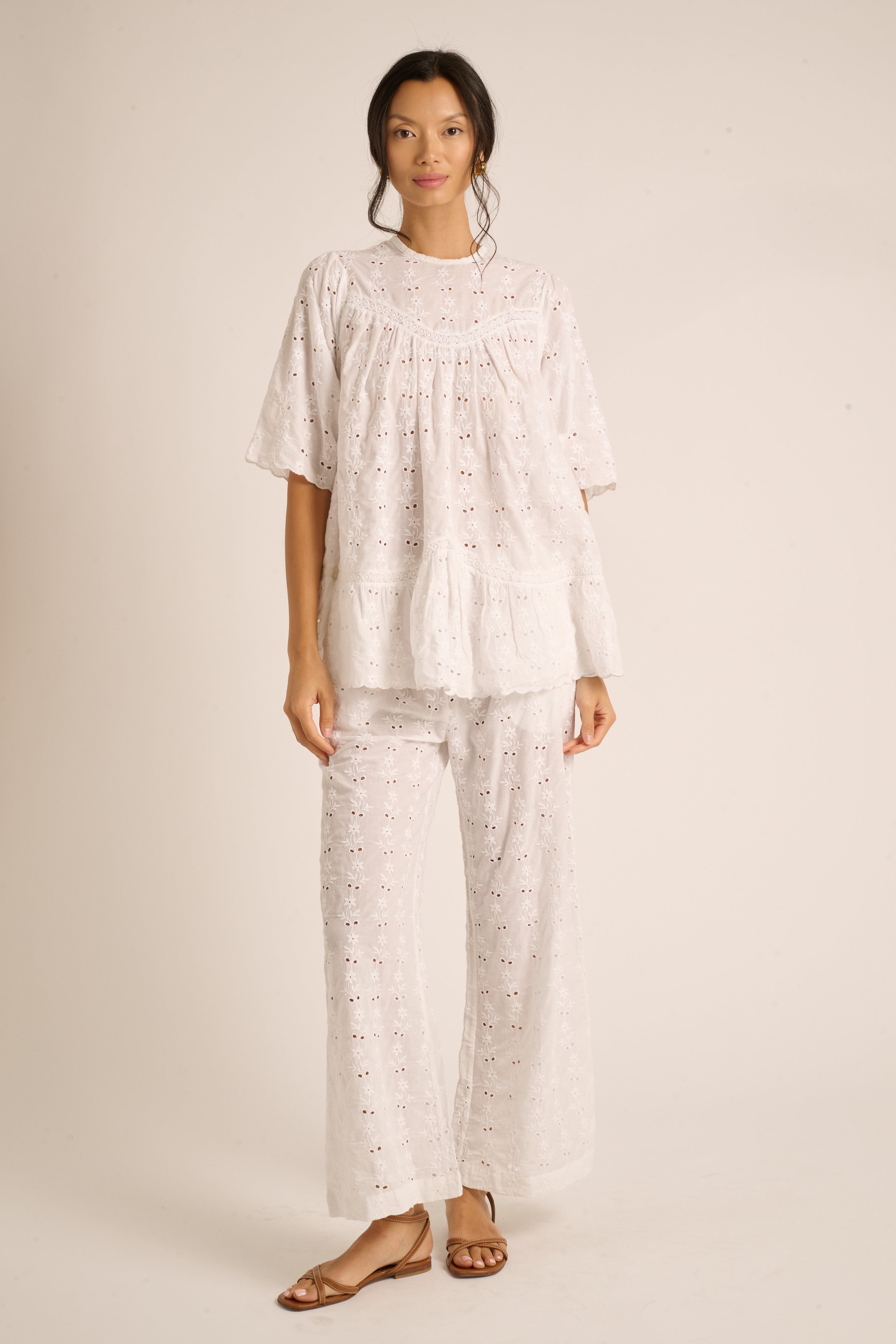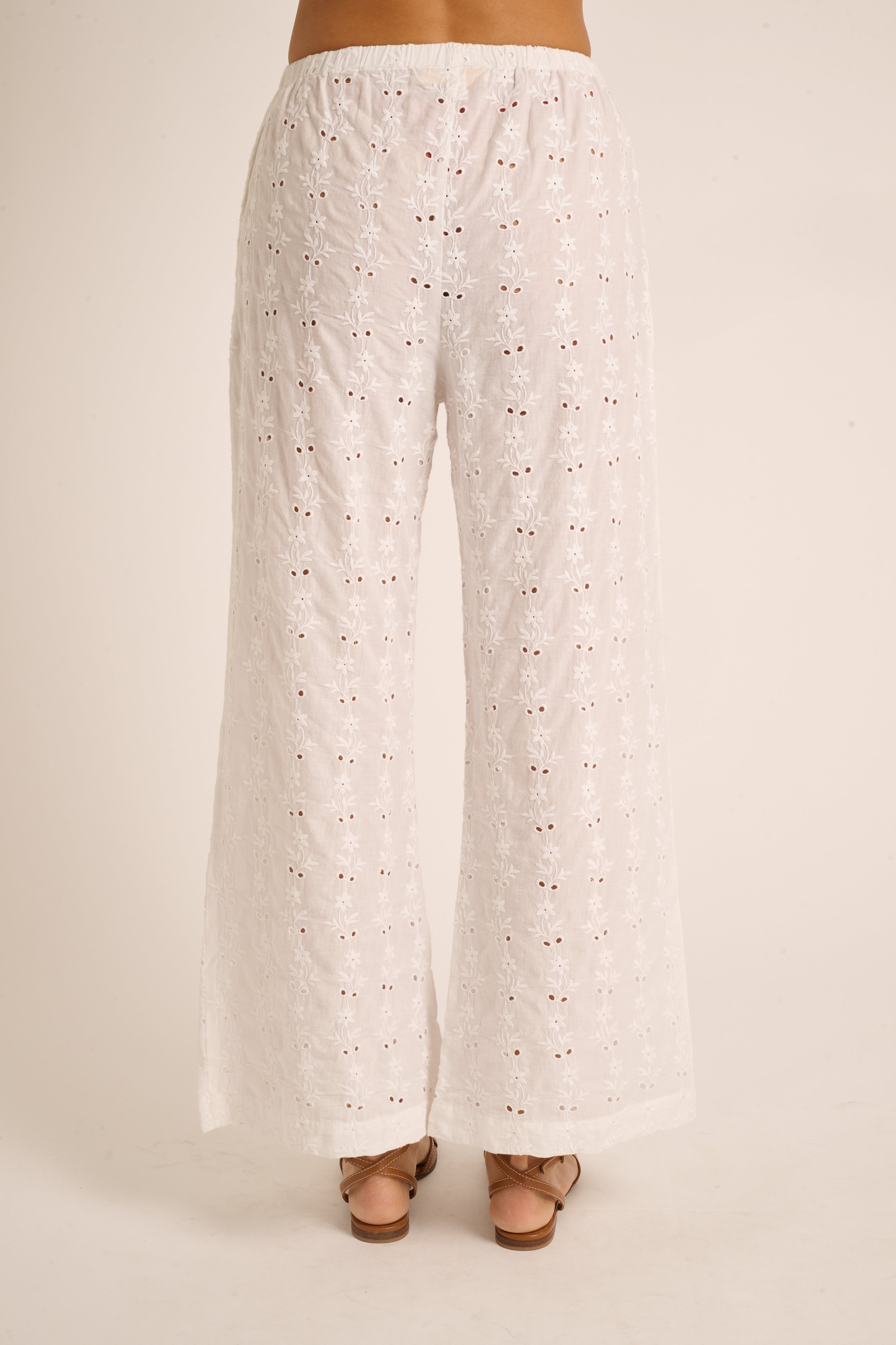 The Nicole Pant is everyone's favorite! She will take you from beach to bar with endless styling opportunities. Designed in our softest cotton eyelet, the pant has a slight kick-flare, pockets and an elastic waist for a flattering and comfortable shape.